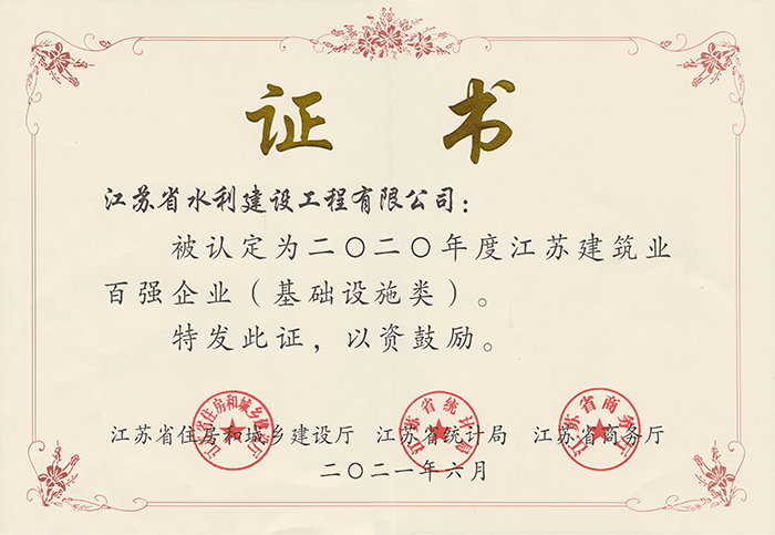 • 江蘇建筑業百強企業2022年度證書